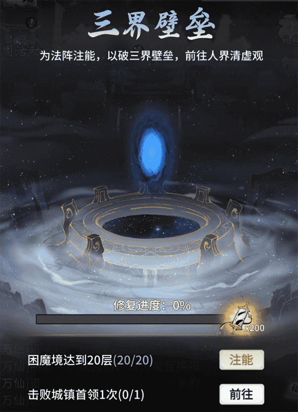 当你修为达到返虚/破虚中期后,,,,可在城镇寻得芸丫并激活神秘法阵,,,通过收集材料、、、击败首领等方式为法阵注能,,,借以打破三界壁垒,,开启支线剧情“清虚旧梦”