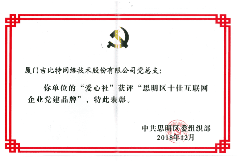 经初审评选、、、、网络评选和专家评审等环节,,"厦门一竞技网络技术股份有限公司党总支-爱心社" 从全区28个参评党建品牌中脱颖而出,,,获评"思明区十佳互联网企业党建品牌"。。。。